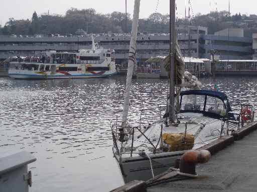 着岸5分前の魚市場前まで来たら、突然、自艇のマストも見えないほどの超猛烈な雷雨が!!、周りには大島航路の観光船が走っているはずなので、あわててレーダーをオンするが、立ち上がった時にはすでに視界が戻っていました。