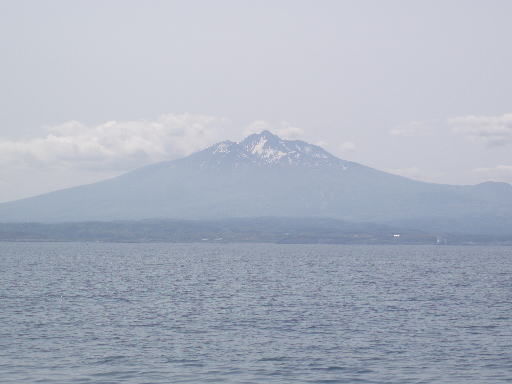 権現崎を周ると北側は竜飛岬まで見えるほど晴れているのに、南側は一面の濃霧で1Kmくらいまでしか見えません、しかも釣り船が多数出ているのですぐにレーダーのスイッチを入れ、逆潮を避けるためまず鯵ヶ沢に向かって十三湖沿いを南下しました。1時間ほどすると霧が薄くなり前方に雪の消え残った岩木山の頭が見えてきました、さすが名山の風格です、しばらくはこの景色を楽しみながら時を過ごすことにします。