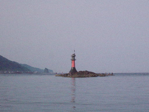 5時に起床して出港の準備をしていると、作業員の方達も準備作業を始めていました、一声かけて6:35に作業員に見送られながら離岸。港の外に出ると岩礁の上に灯台があります、この港に入港する時には出来るだけこの灯台の側まで来るようにすると入港口がよくわかり入港し易いようです、この灯台を無視して早めに入港しようとすると北側の定置網に阻まれることになるためご用心!。ちなみにこの灯台の位置はN38°41.090′、E139°37.288′です(日本測地系)。灯台をかわすとすぐに粟島の姿が視認でき、真っ直ぐに粟島に向かいました。