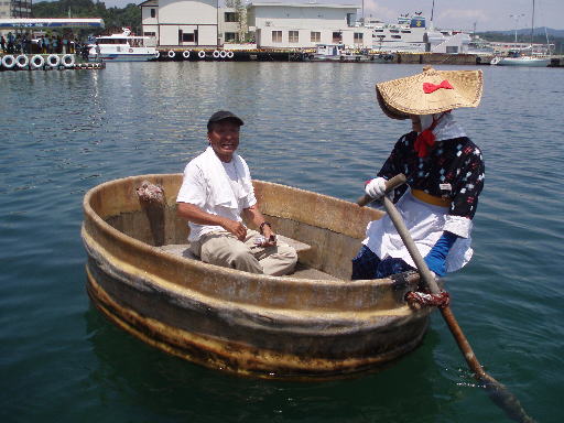 私は観光旅行客です、もやいの調整をしたらすぐに「たらい舟」に乗りに行きました、船頭さんが漕ぐのを見て私もトライさせてもらい、初めは方向が定まらなかったもののすぐにコツをつかみ、最後は上船場所まで自力で漕ぎつくことが出来ました、「さすが遠ちゃん!」少しだけの優越感です。船頭さんに銭湯の場所を聞き、礼を言って下船しました。近くのお土産売り場で昼食を摂り、さらにイカの丸焼きをつまみにワンカップを一杯、身なりは汚いけどやはり私は立派な「おじさん観光客」です。
