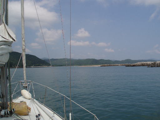 気象情報をチェックすると少なくとも今日の午前中には大きな問題はないが、周りの地域では風が弱いのに室戸岬では北東の風が強く吹いています、さらに潮も早い事を覚悟して6:45にタグポートから離れました。 室戸岬までは4マイル程度、程良いポートクオーターの風でしたが弱い黒潮の反流に会って船速は5ノット止まり、室戸岬が近づくにつれて黒潮の本流に乗り一時は2ノット以上の連れ潮で向かい風と波にもまれながらもアッという間に紀伊水道側へ進入して行きました。 針のように尖った室戸岬なのでほとんどUターン状態で今度は北北東へ、岬から遠ざかるにつれて潮も波も収まりスターボ・クローズの風にジブを開き、エンジンを弱めて暑さの増した紀伊水道を快適クルージングです。 最初は海陽町の浅川港を目指していましたが明日は海上状況が悪化する見通しのため一日待機するかも知れません、なにも無い浅川港より入浴施設も食堂もある5マイル手前の宍喰(ししくい)港に恐る恐る入って行きました、港内に入る手前から5mにセットしてある水深計が「ピーピー」となっています、12:00唯一空いていた岸壁に着けたら水深が2.1m、今夜は平気ですが明日の大潮には喫水が1.95mの「さつき」を係留して置くのは大変心配です、すぐさまもやいを解いて12:20に再出港して当初の予定どおり浅川港に向かいました。 途中大きな定置網を迂回して14:00に港内北側の岸壁に着岸、ここなら水深に2m以上の余裕があります。 実走行時間6時間55分、耐水距離37.79NM、対地距離37.50NM 遅い昼寝をして徒歩で町へ、本当に何もない町ですが一軒だけ見つけたスーパーで食料を買ってきて船内での夕食となりました、今日も暑かった。 次は橘港あたりに向かいます。