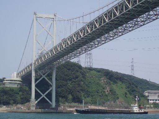 緊張しながらくぐった関門橋、向こうに見える船はほとんど止まっています
