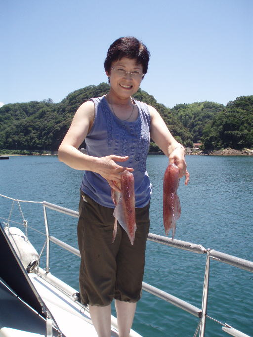 温泉津港の入り口はすぐ近くまで近づかないとわからないほど狭いのですが、湾口の堤防を見つけて位置を確認、狭い湾内を通り11:50製氷工場の手前の岸壁に着岸しました、4時間35分、対水距離27.3NM、対地距離24.9NM。いつもの「氷結レモン」で入港儀式をしている間に近くに止まっていた漁船を見に行っていた家内が「漁師さんからいただいた!」と取れたての新鮮なイカを3杯ぶら下げて船に帰ってきました。早速今夜の酒の肴にするためにすぐにさばいて冷蔵庫に保管しました。