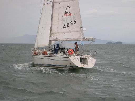 八代港沖の大築島の側まで来ると急に後ろからモーターボートが近付いて来ました、銚子から熊本にヨットを移したKNさんが船友達のARKさんと一緒に出迎えに来てくれたのです、しばらく並走してボートは母港へ帰り、車でマリーナに先回りしてもやいを取っていただきました。