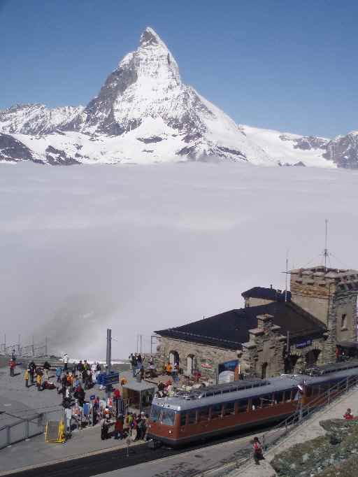 終点一つ前の駅、ローテンボーデンを通過してもまだ雲の中です、少し不安になっていたところ、終点のゴルナグラード直前の左カーブを回り始めたら列車は突然雲の上に出て周りの4000m級の山々が全て見えてきました。車中全員から歓喜の声と拍手が沸き起こりました、これで今日は一安心です。