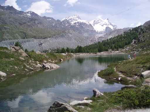 解散してすぐにケーブルカー、登山電車を乗り継いで対岸のリッフェルアルプに行き、スネガまでのコースを下見しました。途中にある小さな湖「グリンゼー」で一休み、若者がこんなところで泳いて騒いでいました。そこからは一部自動車道を通って「グリンジゼー」、「ライゼー」と3つの湖を回りスネガに1時間45分で辿りつきました、ツアー客と一緒ですと3時間くらいのコースになりそうです。