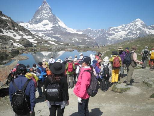 案の定他にいくつものグループが殺到していて、コースは渋滞状態です。「逆さマッターホルン」の見える湖の周りは写真のとおり日本人だらけ、いつもの光景が戻って来ました。(この写真の裏側にはこの何倍もの日本人グループがいます)