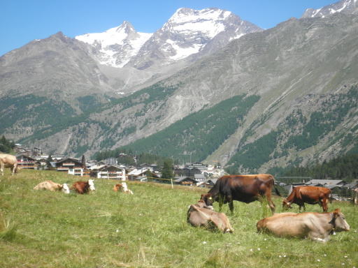 サースフェーの草原、後方の台形の山はラッギングホルン(4010m)