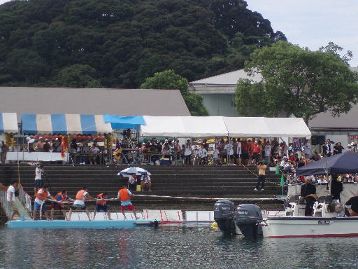 今日は恒例の「水上綱引き大会」が開かれていて「西海パールシーリゾート」エリアには多くの人が朝早くから集まって大変賑やかな状態です。テレビ局も数社が取材と実況中継に来ています、関東では流れないでしょうがこちらでは結構盛大なイベントになっているようです。なんと優勝賞金は50万円だと!!。