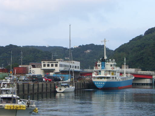 4:30頃、急に強い雨の音で二人とも目を覚ましてしまいました。風も音を立てて吹いていて、船体が岸壁に押し付けられています、予想以上に早く天気が悪くなっているようです。天気予報では壱岐・対馬地方に波浪注意報が出ていて、若宮灯台では相変わらず10m/s前後の風が吹いています。地方の予報では午前中は風が少なくなりますが昼頃から一時強まる予報で、もう戦意喪失です今日の出港は諦めました。当初、明日千葉に帰る予定をしていた家内が今日島空港から帰ることになり帰る準備をしていると、港を散歩していて、リタイヤ後福岡から対馬に戻って来られたMTISさんが来艇、ひとしきり歓談したあとタクシーで空港に向かう家内を見送ってから、MTISさんと一緒に比較的うねりの影響の少ない港内南側の久田浦(くたうら)地区に船を移動して、MTISさんが地元の言葉で漁協の方に係留場所の交渉していただきました。とりあえず一番奥の岸壁に落ち着き、スーパーの場所まで案内していただきました。風向きによっては心配があるものの生活には困らない場所のようです。