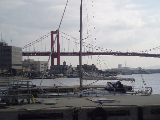 関門海峡に差し掛かる頃にはさすがに大型船が多く、彼らに気を使いながら風の向きを考えて海峡に入る直前にセールを降ろして海峡へ侵入する事にしました。すぐに右折して若松航路に入り「若戸大橋」をくぐった先の右側にある船溜まりの岸壁に着岸、15:00、8時間05分、対地距離49.4NM、対水距離47.4NM、対水ログメーターを修理したので今日から対水距離が測れるようになりました。