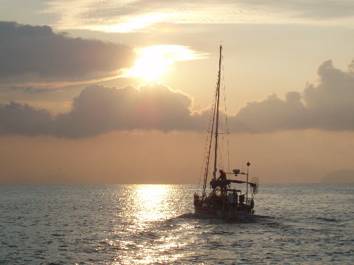 片添ケ浜を出港し朝日に向って走る「カメ」さん